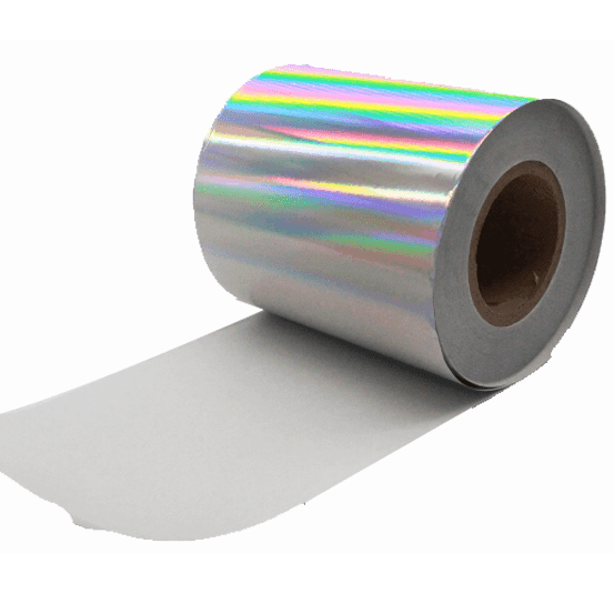 Folie autoadeziva Holografica cu suprafata lucioasa ce reflecta lumina in multiple culori pe un tipar liniar.